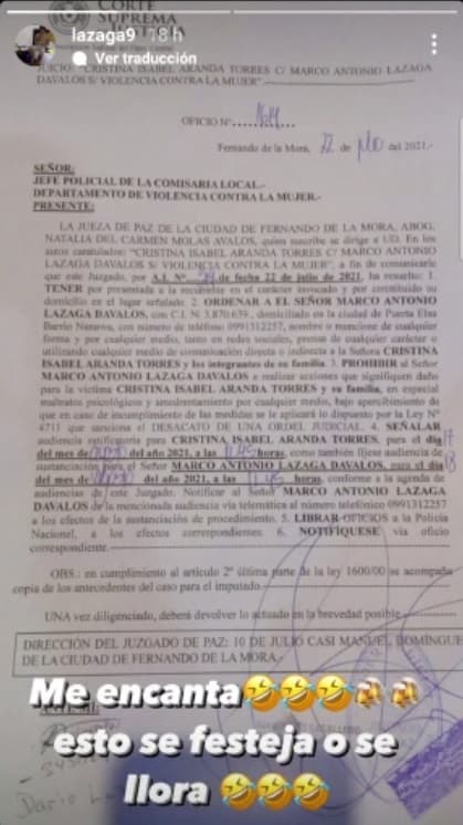 En el escrito se hace referencia a un hecho de violencia contra la mujer y prohíbe a Lazaga referirse a Aranda o a integrantes de su familia. Se cita al exfutbolista para el 18 de agosto para la audiencia de sustanciación.