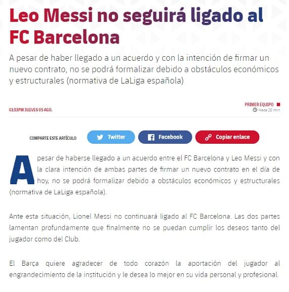 “Ante esta situación, Lionel Messi no continuará ligado al FC Barcelona. Las dos partes lamentan profundamente que finalmente no se puedan cumplir los deseos tanto del jugador como del Club”, continúa.