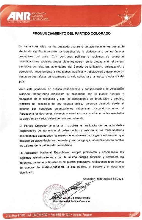 “Ante esta situación de público conocimiento y consecuencias, la Asociación Nacional Republicana manifiesta su solidaridad con el pueblo honrado y trabajador de la república y con los generadores de producción y empleo, víctimas del desarrollo de una agenda política perversa diseñada desde el exterior por conocidas organizaciones extremistas buscando arrastrar al Paraguay a los desmanes, violencia y autoritarismo, cuyos lamentables resultados se aprecian en varios países de nuestro continente”, agrega seguidamente.