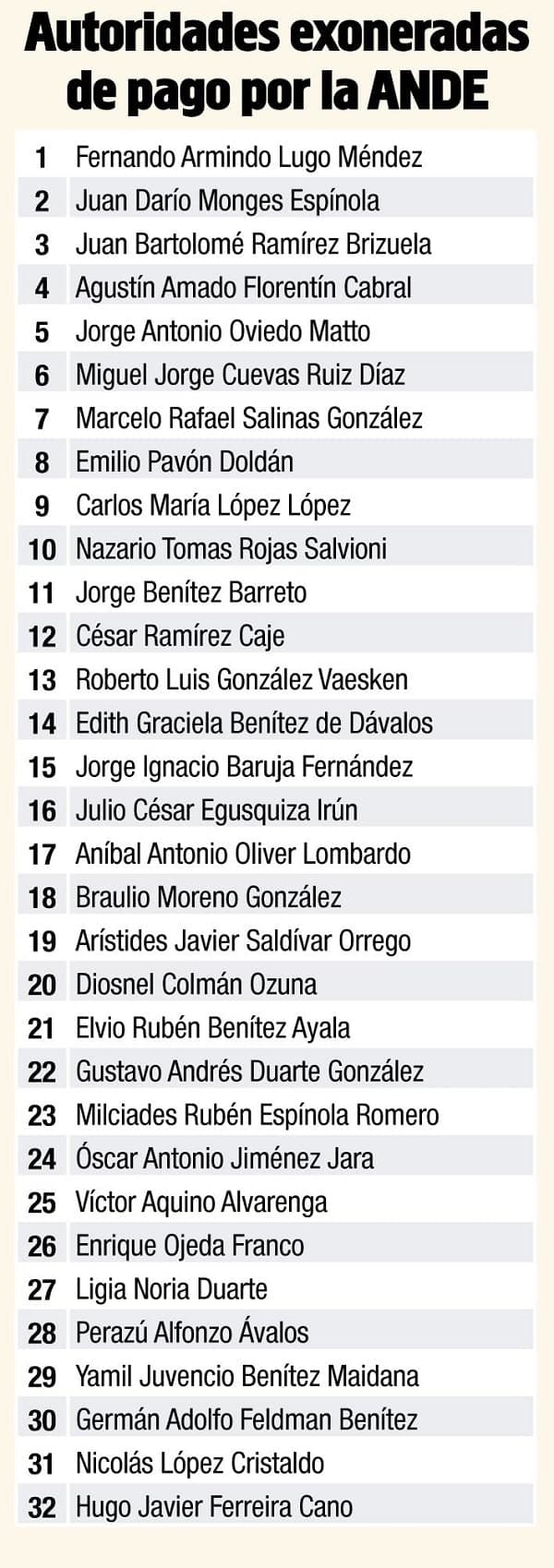 De acuerdo al medio citado, son 32 las autoridades que aparecen en la lista que la propia ANDE dio a conocer.
