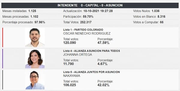 Con casi 97% de las mesas escrutadas, al momento de esta publicación, el colorado llevaba la delantera con 47,69% de los votos (119.169 votos), frente al 41.99% (104.924 votos) de Eduardo Nakayama.