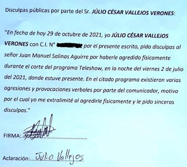 “Yo, Júlio César Vallejos Verones (…), por el presente escrito, pido disculpas al señor Juan Manuel Salinas Aguirre por haberle agredido físicamente durante el corte del programa Teleshow, en la noche del viernes 2 de julio del 2021, donde estuve presente. En el citado programa existieron varias agresiones y provocaciones verbales por parte del comunicador, motivo por el cual yo me extralimité al agredirle físicamente y le pido sinceras disculpas”, es lo que expresa el documento de disculpas, en el marco del acuerdo.
