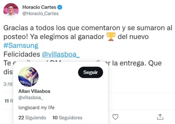 La cuestión tuvo un nuevo capítulo este martes, cuando desde la cuenta de Cartes en Twitter se anunció a un ganador, que resultó ser, al parecer, una cuenta falsa o por lo menos inactiva desde 2013.