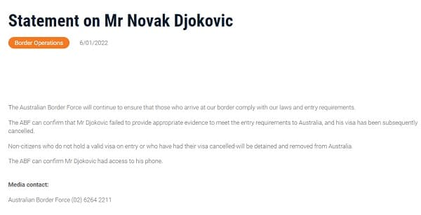 “La ABF puede confirmar que el Sr. Djokovic no proporcionó las pruebas adecuadas para cumplir con los requisitos de entrada a Australia y, posteriormente, se canceló su visa”, indica el comunicado emitido por el ente.