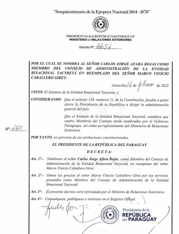 Por decreto 6654, fechado este lunes 14 de febrero, el Presidente de la República Mario Abdo Benítez designó a Carlos Jorge Afara Rojas como nuevo miembro del Consejo de Administración de la EBY.