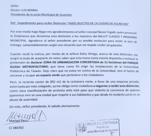 Seguidamente, en el escrito Pecci revela el motivo, “cuando recibí la noticia, por medio de la señora Katty Ortega, acerca de esta distinción; me surgió está duda de aceptarla sin antes saber que esta nueva Junta estaría dispuesta a rechazar la pretensión de declarar Zona de Urbanización Concertada de 11 hectáreas del Parque Guasu Metropolitano; que tiene como fin erigir las instalaciones de la Universidad Politécnica de Taiwán. Dejo en claro que no estoy en contra de la universidad, sino el hecho de cercenar y ocupar un espacio verde que pertenece a los ciudadanos”.