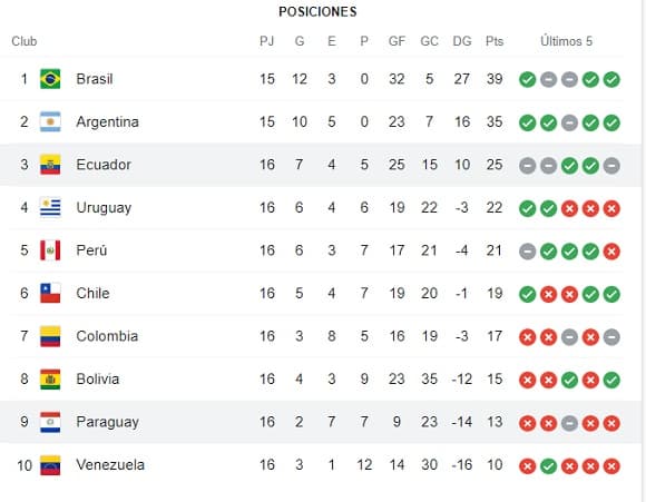 Ecuador está cerca de clasificar a Catar 2022, ya que está tercero con 25 puntos, a 3 del tercero, que es Uruguay. Paraguay está fuera de competencia con solo 13 unidades.