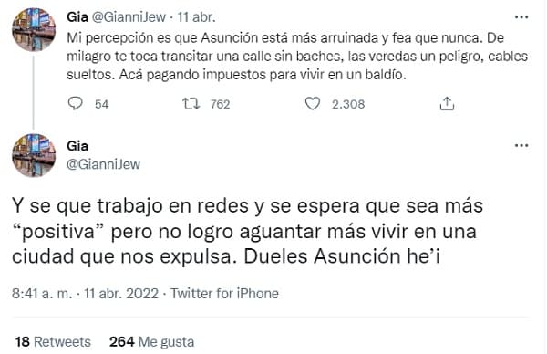 “Y se que trabajo en redes y se espera que sea más “positiva” pero no logro aguantar más vivir en una ciudad que nos expulsa. Dueles Asunción he’i”, agregó.