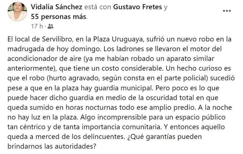 Asimismo dijo temer por sus propios compañeros y colaboradores, por si ocurra un robo a plena luz del día. “Ya no quiero quedarme, tengo miedo por mis compañeros, no hay seguridad. Si lo que querían era sacarme de la plaza, creo que van a lograrlo”, manifestó en contacto con Radio 1000 AM.