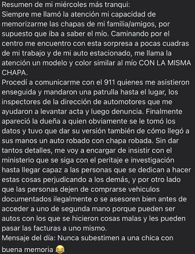 La joven explicó que cuando se percató de la similitud entre un auto estacionado y el suyo, no podía creer la situación y menos que la chapa sea del mismo número, incluso tuvo que buscar una fotografía hacer la comparación y convencerse.