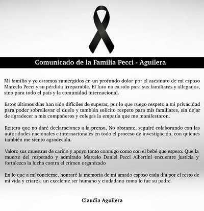 “Mi familia y yo estamos sumergidos en un profundo dolor por el asesinato de mi esposo Marcelo Pecci y su pérdida irreparable. El luto no es solo para sus familiares y allegados, sino para todo el país y la comunidad internacional”, comienza señalando el texto publicado en medios.