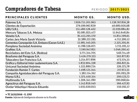“Ninguna de esas personas o empresas compró cigarrillos de Tabesa”, afirmó Ortiz, haciendo alusión a las publicaciones de medios impresos que señalaron que la Fundación Ramón T. Cartes adquirió cigarrillos por casi G. 1.500 millones, entre 2017 y 2021.