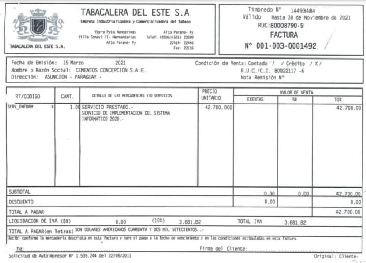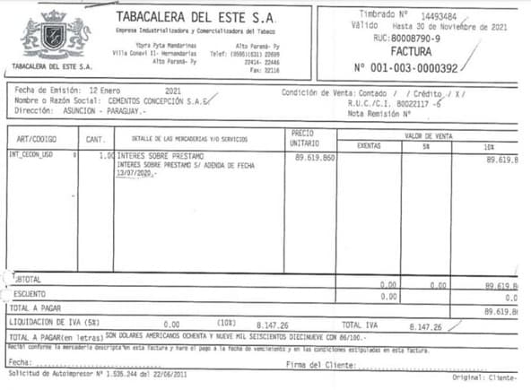 “Los directivos de Tabesa dieron a conocer algunas de las verdaderas facturas emitidas por esta firma a Cementos Concepción SAE. (Cecon), por varios montos, aludidas por ‘la filtración’ de los medios aliados a una feroz operación del Gobierno de turno, en contra del Grupo Cartes, tratando de montar y vender una falsedad como un hecho”, menciona el artículo.