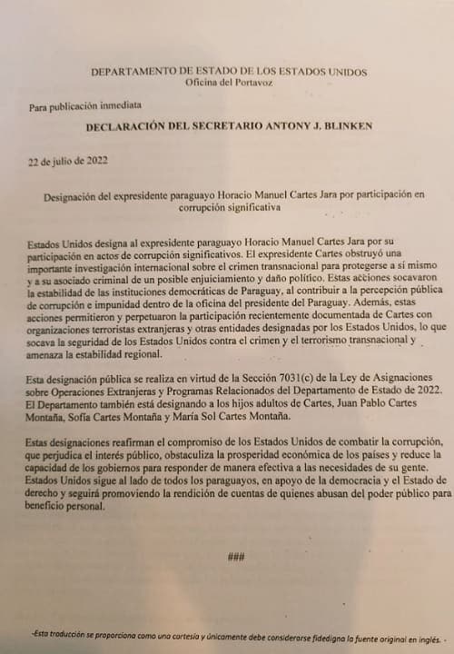 “La designación de Horacio Cartes hace que, como cuestión general, Cartes y sus familiares inmediatos, Juan Pablo Cartes Montaña, Sofía Cartes Montaña y María Sol Cartes Montaña no sean elegibles para ingresar a los Estados Unidos”, agregó posteriormente.