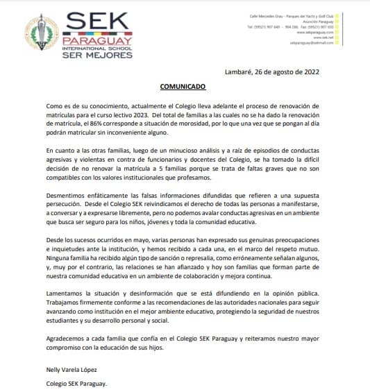“Desmentimos enfáticamente las falsas informaciones difundidas que refieren a una supuesta persecución. Desde el Colegio SEK reivindicamos el derecho de todas las personas a manifestarse, a conversar y a expresarse libremente, pero no podemos avalar conductas agresivas en un ambiente que busca ser seguro para los niños, jóvenes y toda la comunidad educativa”, refiere el comunicado.