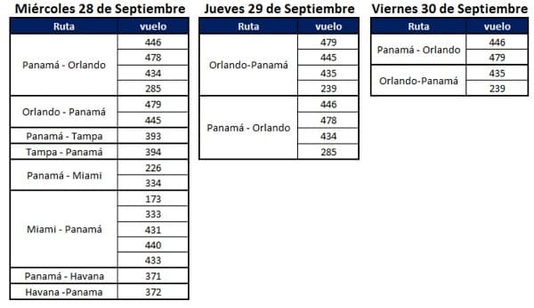 La compañía se vio obligada a cancelar vuelos desde y hacia Orlando, Tampa, Miami (Estados Unidos) y Habana (Cuba) entre 28 y el 30 de septiembre, informó Copa. En tanto, las operaciones desde y hacia Ft. Lauderdale (Estados Unidos), por el momento, permanecen según los itinerarios establecidos.