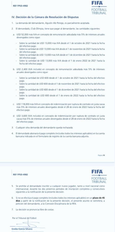 De acuerdo al documento publicado por medios, son varios conceptos por los cuales Olimpia debe desembolsar más de USD 170.000 a favor del futbolista.