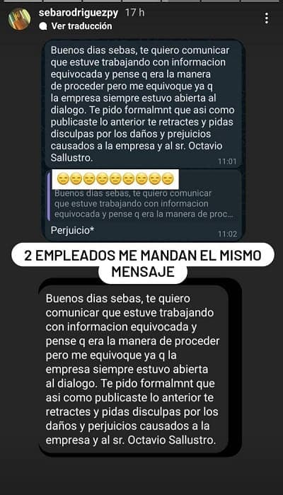 Asimismo, expuso el mensaje que le llegó por parte de la empleada, que en un principio dijo que había denunciado a la empresa y que decía lo siguiente: “Buenos días Sebas, te quiero comunicar que estuve trabajando con la información equivocada y pensé que era la manera de proceder pero me equivoqué ya que la empresa siempre estuvo abierta al dialogo. Te pido formalmente que así como publicaste lo anterior, te retractes y pidas disculpas por los daños y perjuicios causados a la empresa y al Señor Osmar Sallustro (sic)”.