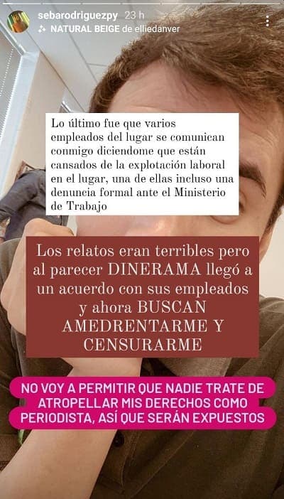 “Los relatos eran terribles, pero al parecer Dinerama llegó a un acuerdo con sus empleados y ahora buscan amedrentarme y censurarme, no voy a permitir que nadie trata de atropellar mis derechos como periodista así que serán expuesto”, dio a conocer en su red social.