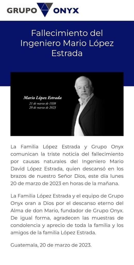 Este lunes 20 de marzo falleció el empresario Mario López Estrada, según informó su familia y el grupo Onyx mediante un comunicado, indica la nota publicada por el medio TV Azteca de Guatemala.