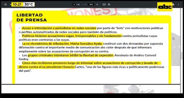 Asimismo, se menciona que el diario Cinco Días, recibieron presiones luego de informar acusaciones de corrupción y lavado de dinero contra el expresidente de la República Horacio Cartes, a quien consideran “una de las personas política y económicamente más poderosas del país”.