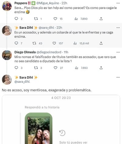 “Pipo Dios pio es tan hdp así como parece!? (sic)”, le consultó un usuario, a lo que Sara no dudó en responder: “Es un acosador, y además un cobarde al que te le enfrentas y se caga encima”.