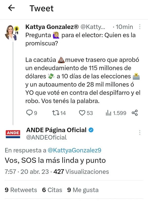Pero lo llamativo del caso consistió en que la cuenta oficial de la Administración Nacional de Electricidad (ANDE) en Twitter respondió a lo dicho por la legisladora con: “Vos SOS la más linda y punto”.