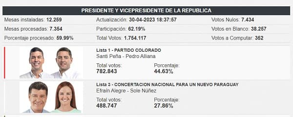 Con casi el 60% de las mesas escrutadas, los colorados tenían una diferencia a favor de casi 300.000 votos, al momento de esta publicación.