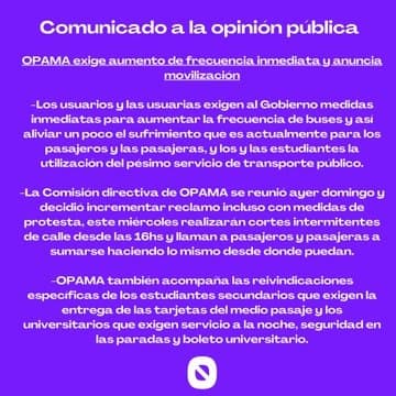 El comunicado de Opama es un llamado directo al Gobierno: “Los usuarios y las usuarias exigen medidas inmediatas para aumentar la frecuencia de buses y así aliviar el sufrimiento que actualmente padecen los pasajeros, las pasajeras y los estudiantes por el pésimo servicio de transporte público”.