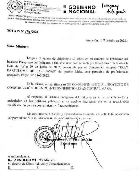 Los abogados de la comunidad Maká, Gustavo Colmán y Amílcar Ayala Bonzi, denunciaron en 2021 ante la Dirección Nacional de Contrataciones Públicas (DNCP) que la construcción del puente “Héroes del Chaco” afecta las tierras del pueblo Maká. Presentaron pruebas como el mencionado decreto, resoluciones del Instituto Nacional de Desarrollo Rural y de la Tierra (Indert) y sentencias judiciales.