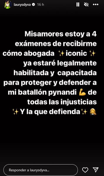 En un emotivo mensaje compartido en su cuenta de Instagram, Laurys aseguró que pronto estará legalmente habilitada para defender a su “batallón pynandi”, como cariñosamente llama a su club de seguidores. “Ya estaré legalmente capacitada para proteger y defenderles de todas las injusticias”, escribió en la red social.