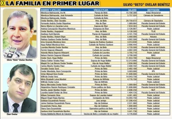 El “álbum familiar” de Silvio Ovelar en la función pública se ha llenado de manera preocupante, abarcando desde la Cámara de Diputados hasta las deseables entidades binacionales. En total, son 11 miembros, incluyendo al propio senador, que se benefician de esta red de cargos públicos. Según cálculos, esta red de nepotismo representa una erogación mensual de G. 291.923.396 para el Estado paraguayo.