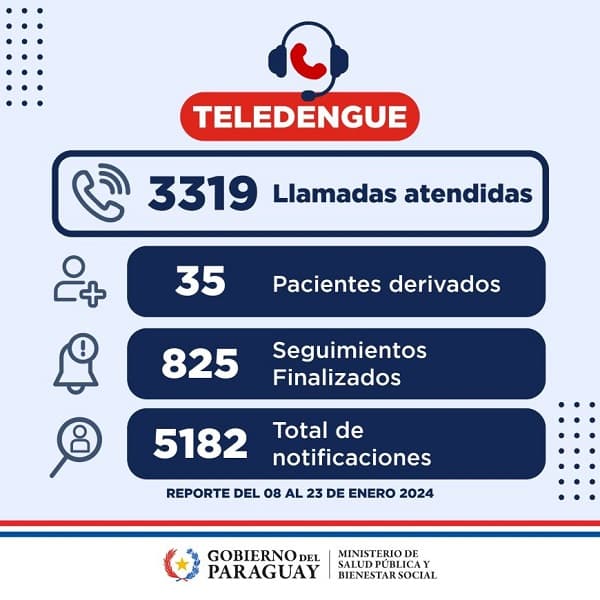 El Ministerio de Salud desplegó Teledengue como respuesta al incremento de casos de dengue. Durante el periodo del 8 al 23 de enero, este servicio telefónico proporcionó vigilancia efectiva a 3.319 individuos, de los cuales 2.459 prosiguen en proceso de monitoreo, en tanto 825 recibieron el alta, y solo 35 requirieron volver a un hospital.