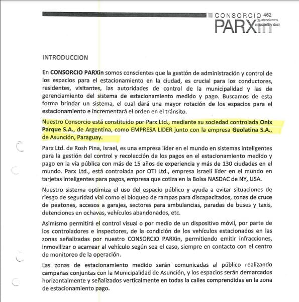 Parxin había detallado en su propuesta que Parx Ltd., mediante Onix Parque, era la empresa líder del proyecto debido a su experiencia global en sistemas de gestión y pago para estacionamientos. Incluso resaltaba que Parx estaba controlada por la firma multinacional OTI, referente mundial en tarjetas inteligentes para pagos.