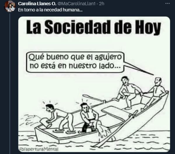 La ilustración compartida por Llanes representa a cuatro individuos en un bote a punto de hundirse, ignorantes de su mutua dependencia para la supervivencia. El comentario de uno de ellos, indiferente al peligro inminente que enfrentan los demás, sirve de metáfora para la situación política actual.