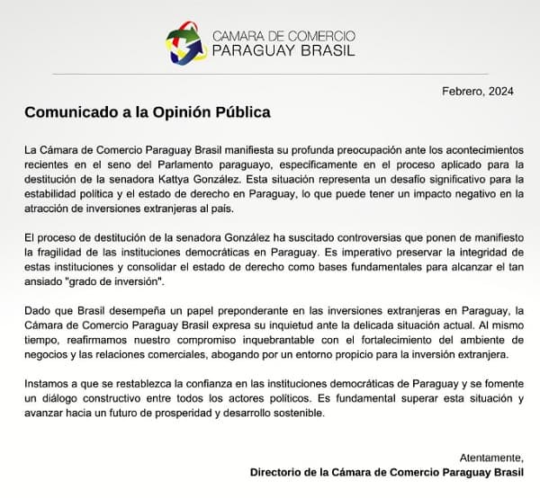 La Cámara de Comercio Paraguay-Brasil emitió un comunicado expresando su “profunda preocupación” por la situación de inestabilidad en el Senado tras la expulsión de la senadora Kattya González.