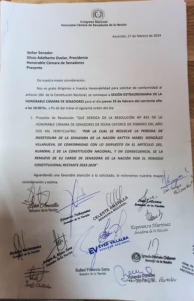 Cabe recordar que la pérdida de investidura de Kattya González se definió por 16 votos a favor y 12 en contra en la sesión extraordinaria del 30 de enero pasado, convocada a pedido de los parlamentarios del movimiento Honor Colorado, sector mayoritario del Partido Colorado liderado por el ex presidente Horacio Cartes.
