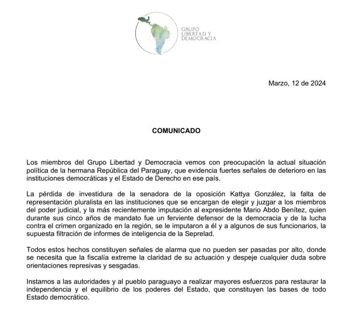 En el centro de sus cuestionamientos se encuentran dos acontecimientos que han sacudido la escena política paraguaya: la polémica destitución de la exsenadora opositora Kattya González y la imputación al expresidente Mario Abdo Benítez. Ambos hechos son calificados como “líneas rojas” para la democracia paraguaya, despertando alarmas en el seno del Grupo Libertad y Democracia.