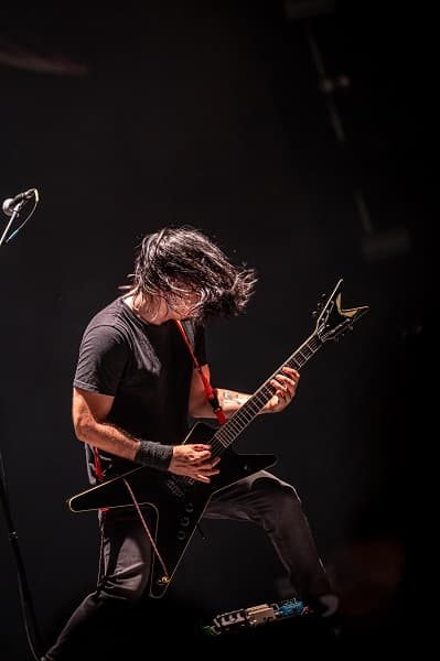 El escenario se convirtió en una fiesta de guitarras cruzadas, bajos que iban de un extremo a otro y una pared de batería imponente. Los temas como “Skin o’ My Teeth”, “Hangar 18” y “In My Darkest Hour” se entrelazaban con cambios de luces que impactaban y acompañaban el sonido poderoso de la banda, sonando impecablemente ajustada.
