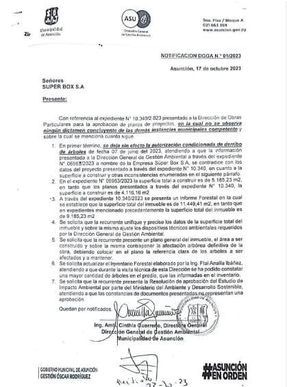 En paralelo, la revocación de la autorización de tala otorgada al Supermercado Box, emitida por la Dirección de Gestión Ambiental de la Municipalidad de Asunción el 17 de octubre de 2023, se sustenta en inconsistencias documentales detectadas en la solicitud de la empresa.