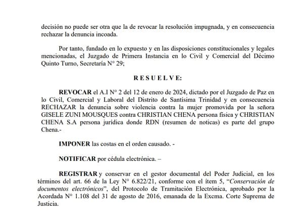 La resolución original, dictada por el Juzgado de Paz en lo Civil, Comercial y Laboral del Distrito de Santísima Trinidad en enero de 2024, había hecho lugar a una denuncia por violencia contra la mujer presentada por Zuni Mousques. En ella, se acusaba a Chena y RDN de incurrir en violencia mediática, telemática y contra la dignidad al difundir información sobre supuestos actos de corrupción que la involucraban.