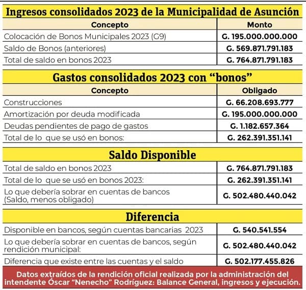 Curiosamente, las 13 cuentas bancarias creadas para las emisiones de bonos sólo suman G. 540 millones, ni siquiera un 0,1% del saldo faltante. Incluso sumando todas las cuentas de la comuna, apenas alcanzan G. 32.112 millones.