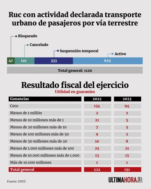 En cuanto a la actividad declarada por el sector de transporte urbano o suburbano de pasajeros, actualmente se contabilizan 625 empresas con registro único del contribuyente (RUC) activos, mientras que 41 se encuentran bloqueados, 121 están cancelados y 333 mantienen una suspensión temporal. Además, la DNIT informó que en lo que va del año, cinco empresas de transporte cancelaron su RUC, sumándose a las 116 que ya habían sido canceladas hasta el 2021.