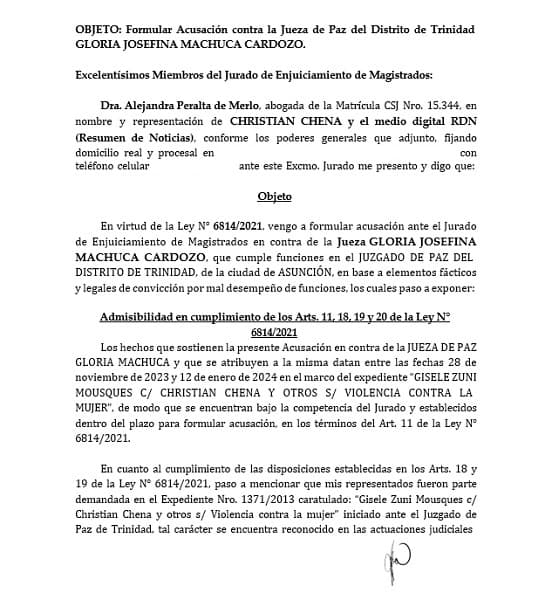 La jueza de Paz de Trinidad, Gloria Machuca, ha sido acusada ante el Jurado de Enjuiciamiento de Magistrados (JEM) por la abogada Alejandra Peralta Merlo, en representación del empresario Christian Chena. La denuncia se basa en supuestos actos de prevaricato y mal desempeño de funciones, relacionados con la emisión de siete resoluciones judiciales que prohibieron publicaciones sobre la abogada Gisele Zuni Mousques.