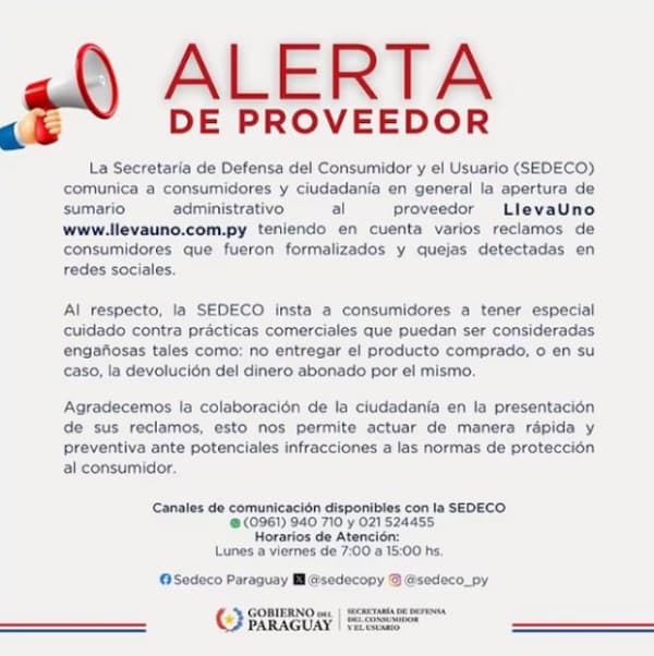 Un comunicado fue emitido por la Secretaría de Defensa del Consumidor y el Usuario (Sedeco) para alertar a los consumidores sobre la apertura de un sumario administrativo a la empresa proveedora LlevaUno, cuyo sitio web es www.llevauno.com. La medida fue tomada en respuesta a diversas denuncias presentadas por clientes que sospechan de prácticas comerciales engañosas por parte de la compañía.