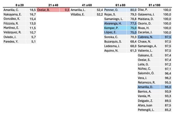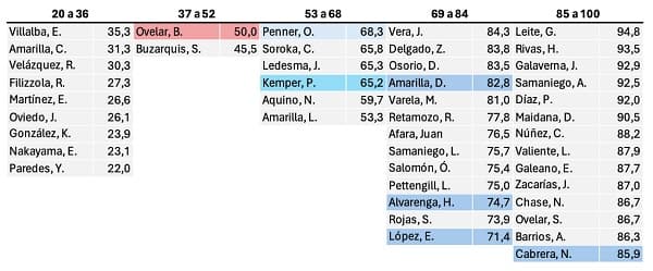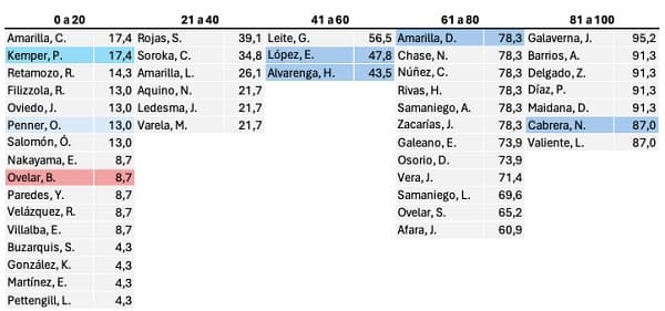 En este caso, los votos se concentraron en los extremos, con 23 senadores apoyando los proyectos oficialistas en el 81% de las veces o más. Este grupo incluye a Noelia Cabrera, Javier “Chaqueñito” Vera, Dionisio Amarilla y Zenaida Delgado, todos con una coincidencia del 90% o más con el líder de la bancada de HC.