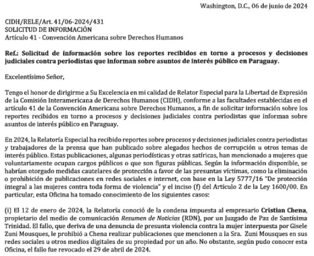 La CIDH ha expresado su preocupación por la situación de la libertad de prensa en Paraguay, solicitando información sobre varios casos similares y las medidas adoptadas por el Estado para garantizar que las decisiones judiciales se ajusten a los estándares interamericanos de libertad de expresión.