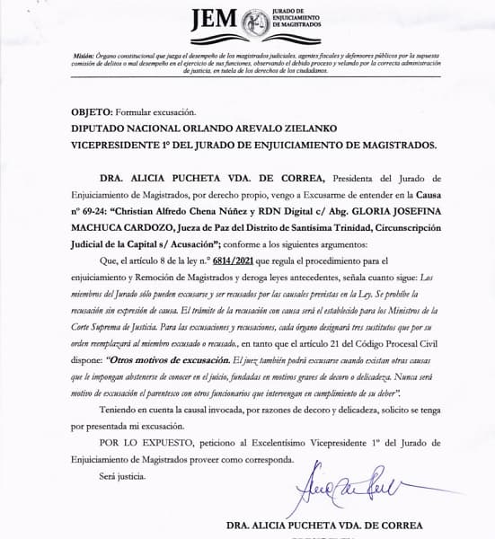 La excusación de Pucheta, presentada el 15 de julio, fue dirigida al diputado nacional Orlando Arévalo Zielanko, vicepresidente 1° del Jurado de Enjuiciamiento de Magistrados.