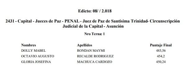 Los miembros del Consejo de la Magistratura integraron la terna para juez de paz con Dolly Mabel Rondán Maymi (483,56 puntos), Octavio Augusto Recalde Rodríguez (454,2) y por último Gloria Josefina Machuca Cardozo con un puntaje de 450,24.