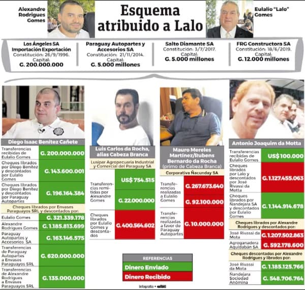 Las sospechas apuntan a que el dinero manejado por Gomes y su hijo se habría mezclado con sus actividades comerciales legítimas en un intento de blanqueo. El documento detalla operaciones que involucran a personas con antecedentes por narcotráfico y lavado de dinero, entre ellas Luis Carlos da Rocha, alias “Cabeza Branca”, Rubens Bernando Da Rocha, Mauro Arnaldo Mereles Benítez, Diego Isaac Benítez y Antonio Joaquim da Mota.